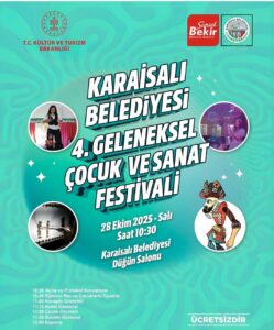 Karaisalı Belediyesi tarafından düzenlenen 4’üncü Geleneksel Çocuk ve Sanat Festivali, 28 Ekim Salı günü Karaisalı Belediyesi Düğün Salonu’nda gerçekleştirilecek. Kültür ve Turizm Bakanlığı’nın katkılarıyla düzenlenen etkinlikte çocuklar doyasıya eğlenecek.